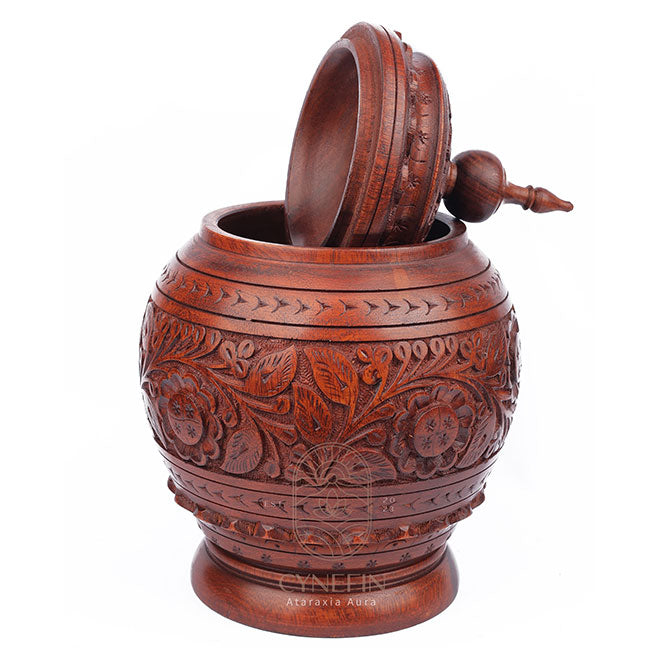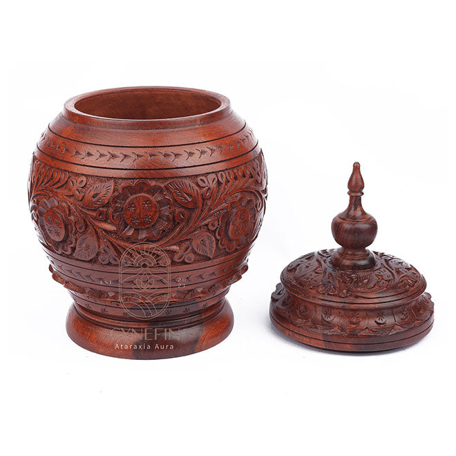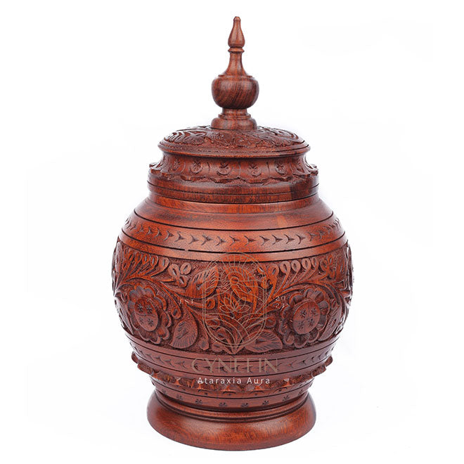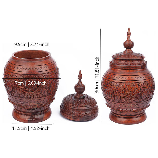 Bring timeless elegance into your space with our Handcrafted Indian Rosewood Jar, an exquisite blend of artistry and functionality. Carved from Sheesham wood, this 30cm-tall oval-shaped jar showcases intricate, hand-carved floral patterns, adding a touch of sophistication to any setting.