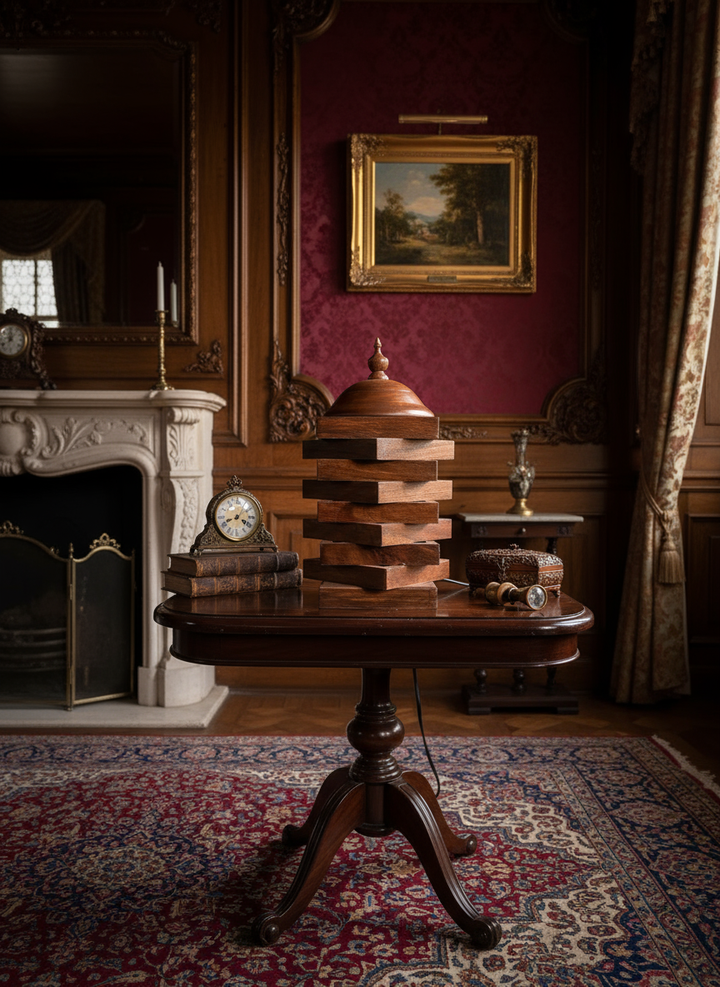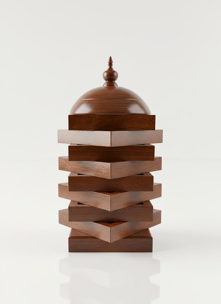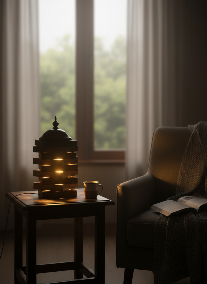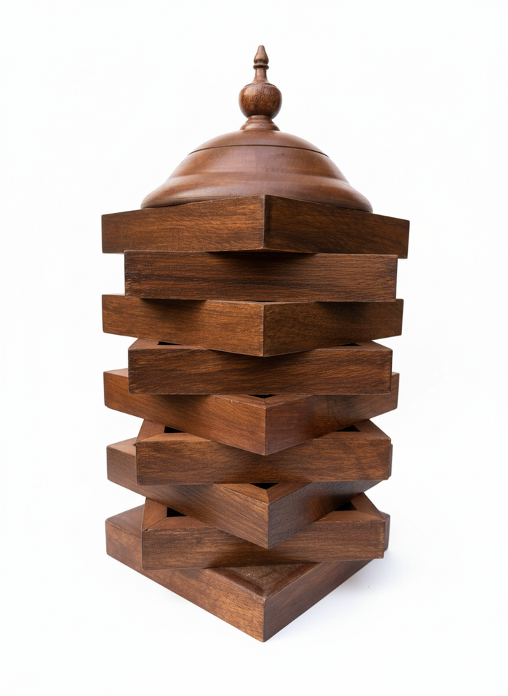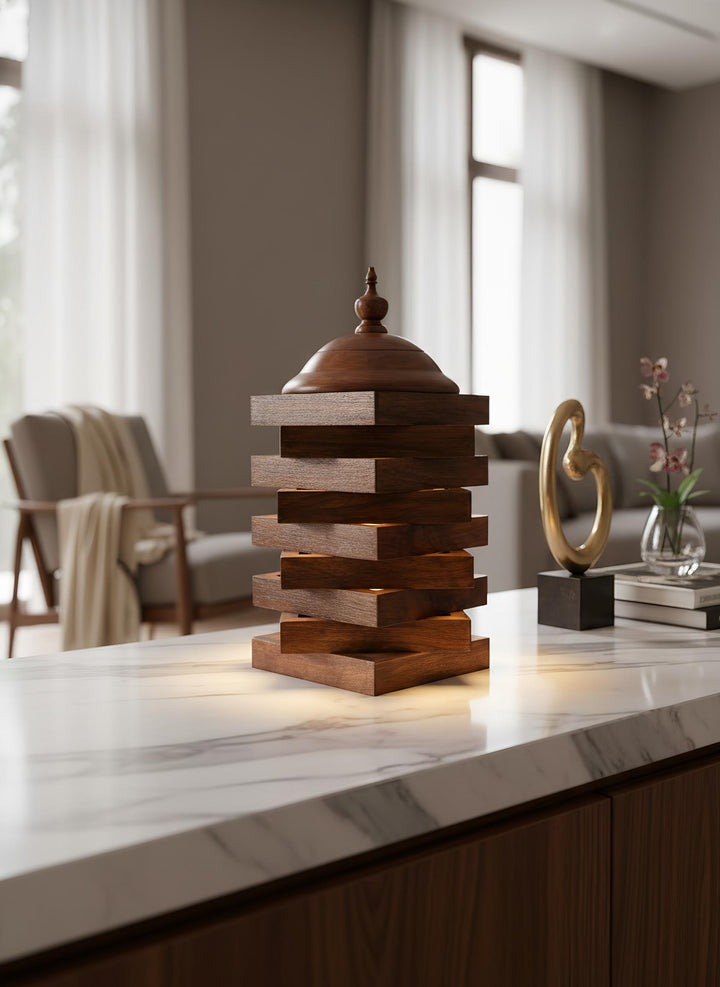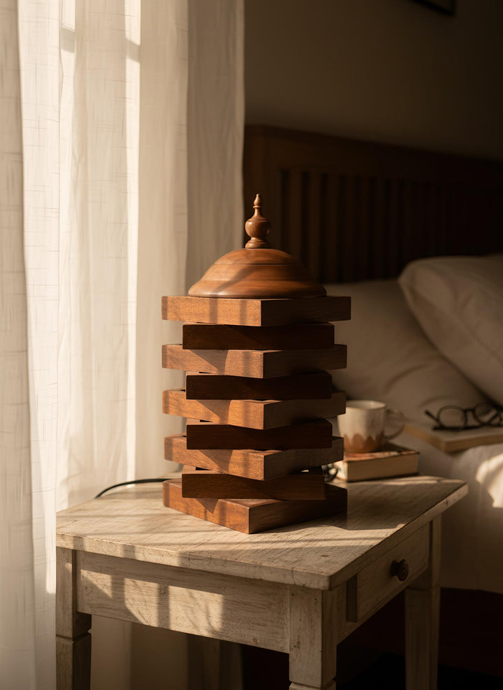 This exquisite table lamp, crafted from premium Indian Rosewood, is a stunning representation of the elegance and artistry inherent in Pakistani craftsmanship. The lamp features a unique tiered design that not only serves as a functional lighting solution but also acts as a captivating decorative piece for any room.